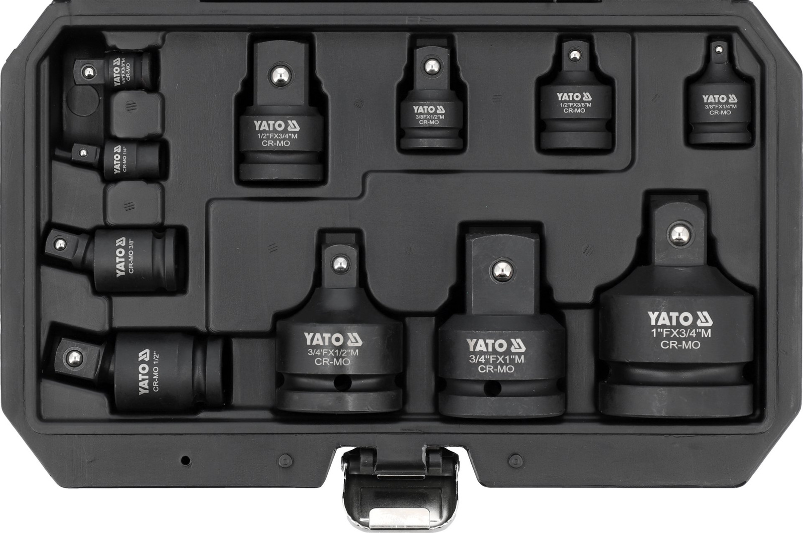 - Yato YT-10646 je sada redukčních a nárazových kloubů z CrMo oceli. Určeno pro použití s rázovými klíči v dílnách a servisech. Obsahuje spoje 1/4", 3/8", 1/2" a redukce 1/4" až 1". Ideální pro profesionální použití.