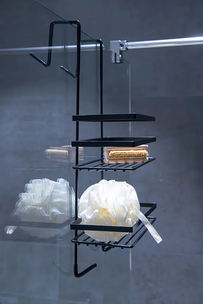 Koupelnová polička je vyrobena z černého lakovaného kovu s matným povrchem.