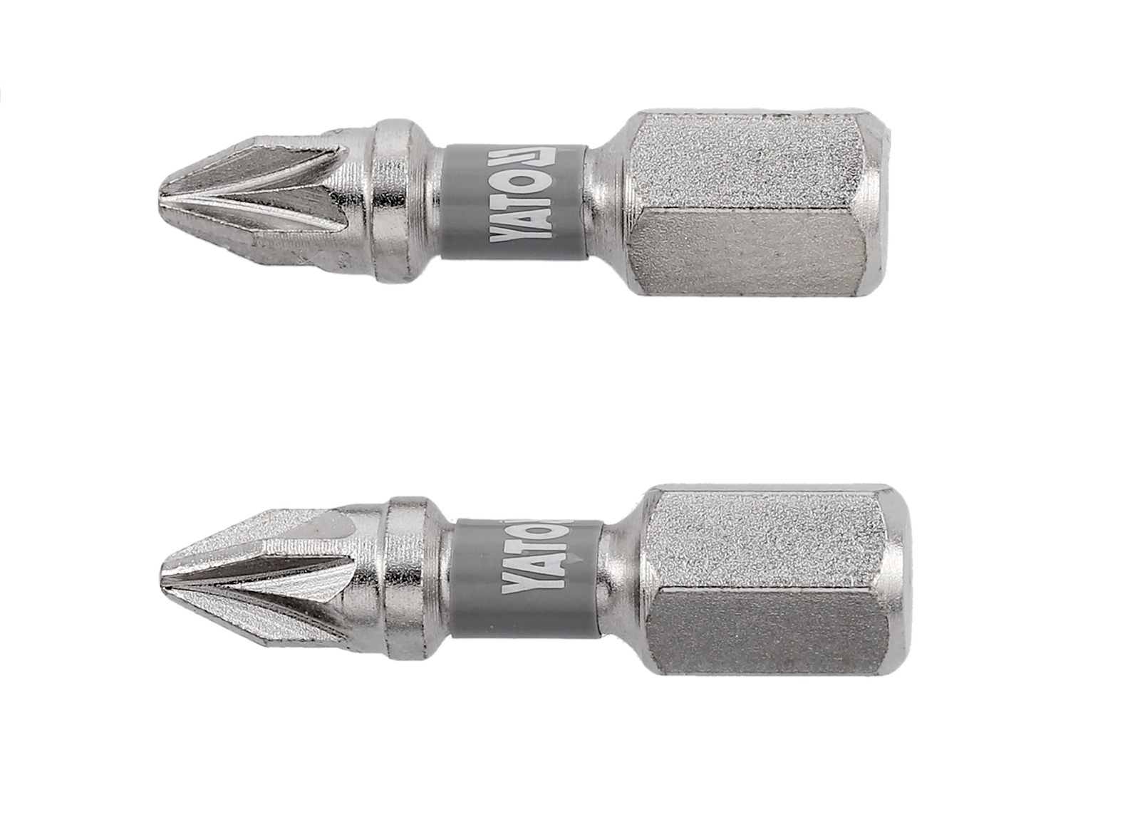 - Bity Yato YT-78003 PZ1 (2 ks).) 25 mm, z odolné oceli S2 s niklovým povlakem. Pasuje na šroubováky 1/4" HEX, ideální pro montážní a servisní práce. Odolnost proti opotřebení pro přesné zavádění šroubů.