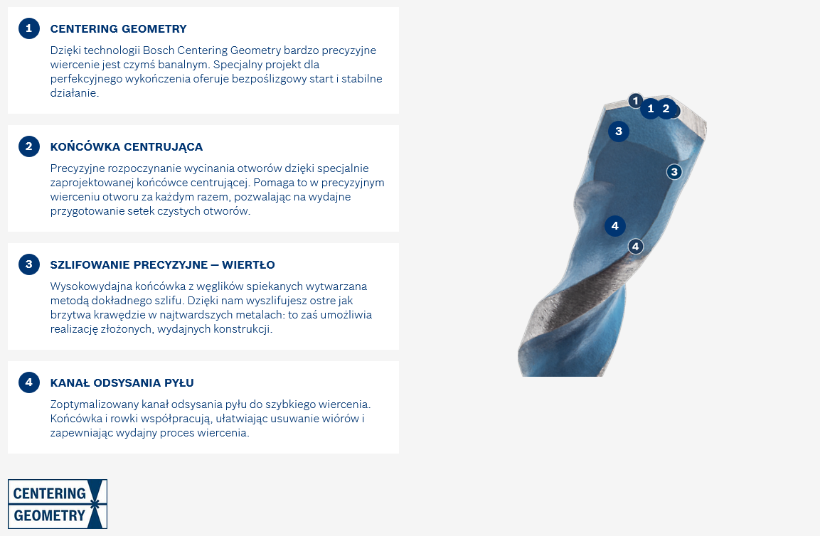 - Díky technologii Bosch Centering Geometry je přesné vrtání velmi snadné