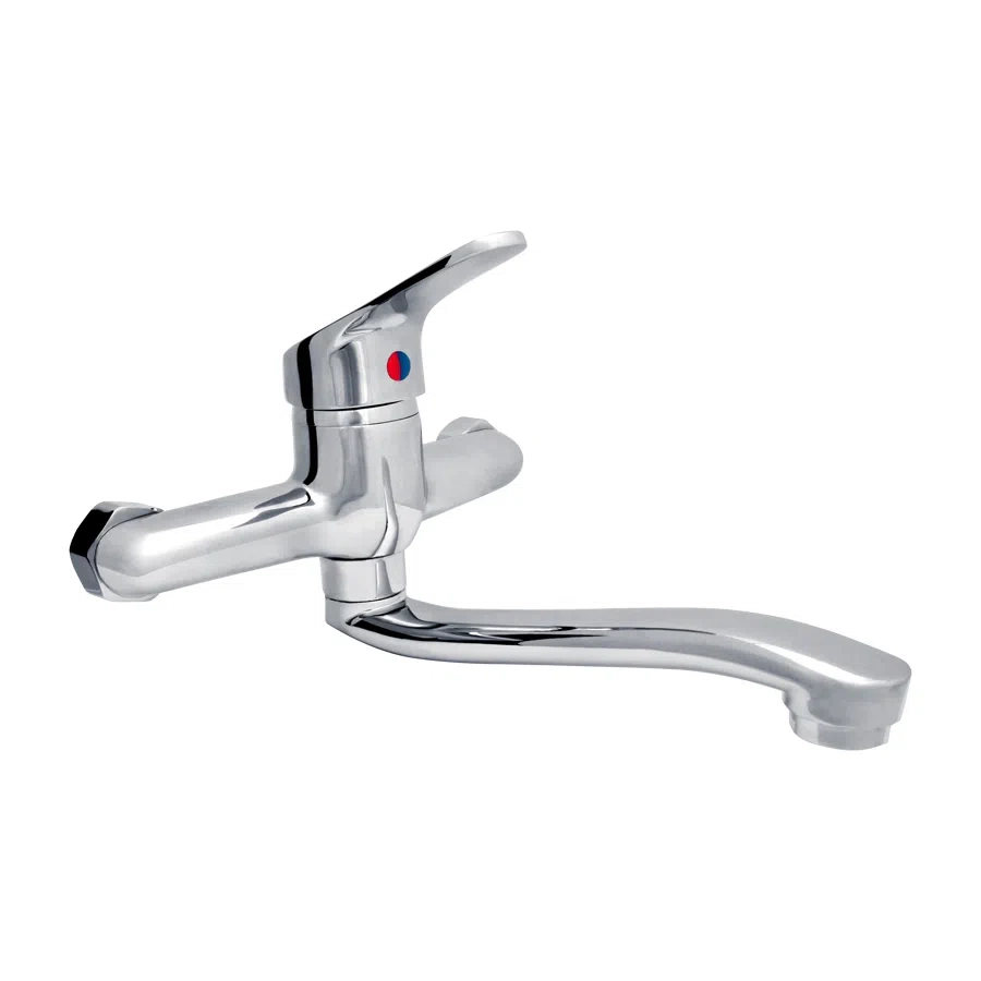 Mechanický, jednopákový, dvouotvorový, nástěnný, s pohyblivým, profilovaným výtokem 20 cm, s perlátorem proti vodnímu kameni.