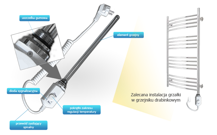 - Zařízení se skládá z topného tělesa se speciální konstrukcí, elektronického termostatu, který zajišťuje přesnou regulaci teploty radiátoru (možnost nastavení minimální teploty 10 stupňů Celsia, zabraňující zamrzání vody v instalaci) a napájecího kabelu třídy I s univerzální zástrčka.