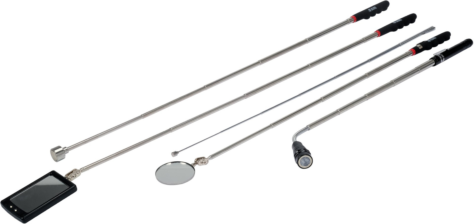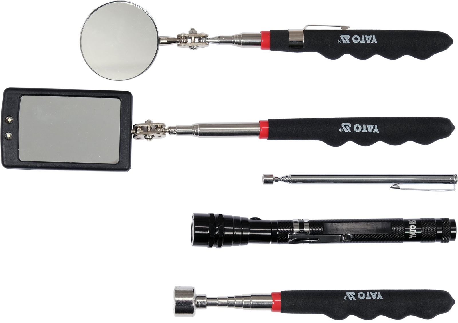 - Inspekční sada Yato YT-06622 (5 kusů): teleskopická zrcátka (kulaté, obdélníkové s LED), magnetické chapadla (malé, velké), svítilna s ohebným kloubem. Perfektní pro diagnostiku a opravy na těžko dostupných místech.