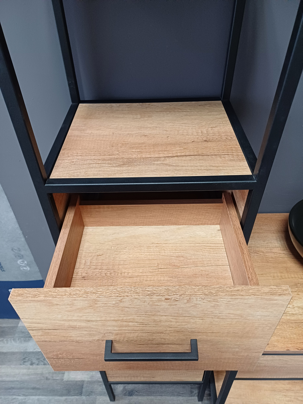 - Uvnitř jsou dvě výškově nastavitelné skleněné police a venku jedna z laminované dřevotřísky. Kombinace černého kovového rámu s dekorem dřeva dodává tomuto nábytku jedinečný charakter, který se hodí k koupelnovým aranžmá v industriálním stylu.Technické údaje: