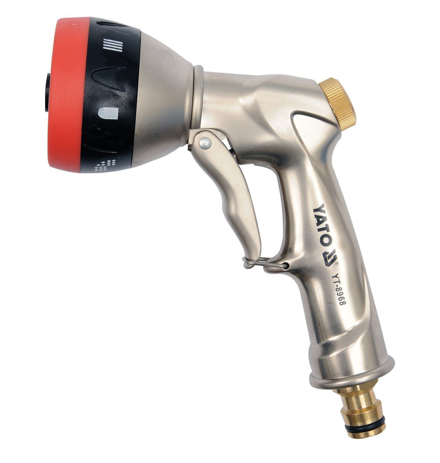- Kovový pistolový postřikovač Yato YT-8968 nabízí 7 funkcí postřiku, od jemné mlhy až po silný proud. Odolné pouzdro, pohodlná rukojeť a zámek ovládání. Ideální pro zalévání a čištění.