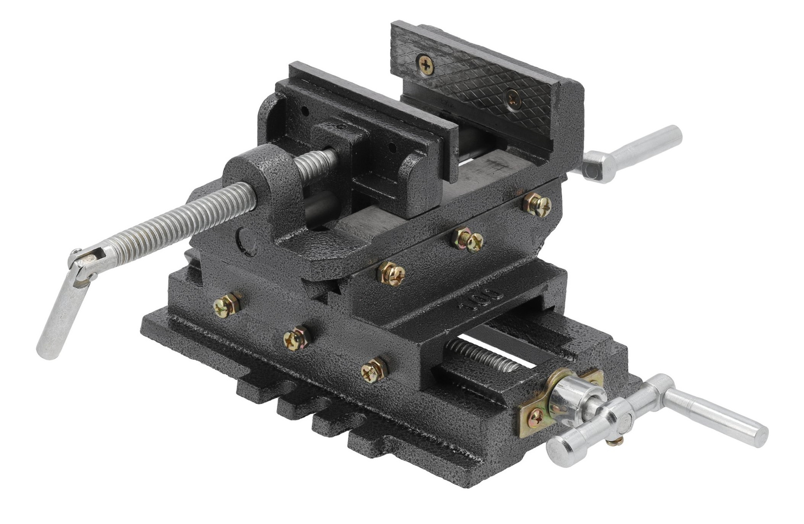 - Litinový křížový svěrák pro svislé a vodorovné práce. Umožňuje přesné polohování a stabilizaci materiálu. Zeměpisná šířka. čelisti 100 mm, otvor 80 mm, trapézový šroub, stolní nástavec, hmotnost 7,2 kg.