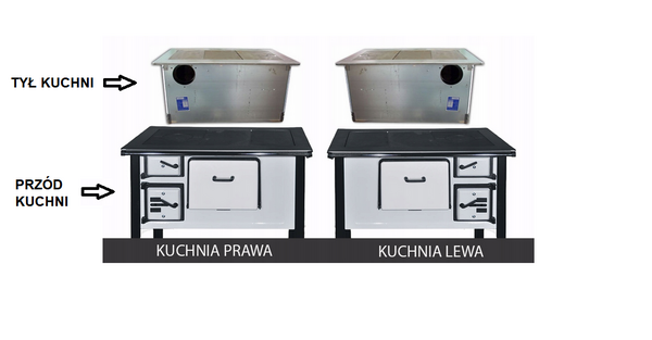 POZNÁMKA: pro správný výběr verze kuchyně (pravá nebo levá) je na druhé fotografii umístění vývodu spalin při pohledu na zadní stranu kuchyně!