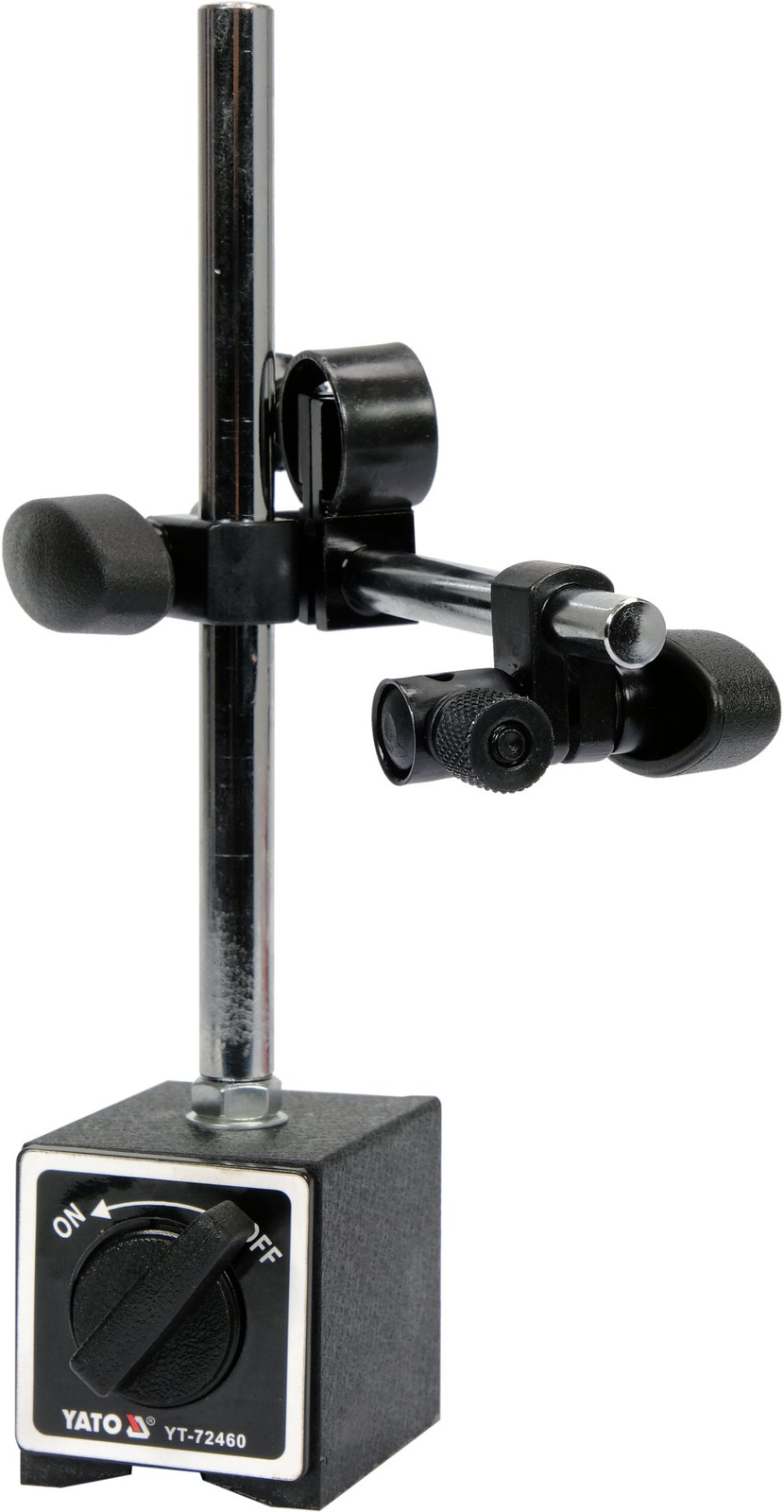 Profesionální magnetický stojan YT-72460 pro číselníky YT-72450 a YT-72453. Má pružinový kloub pro přesné umístění číselníku na měřený díl. Současné uzamčení středního a horního kloubu centrálním knoflíkem. Magnetická základna s hranolovou drážkou pod ní. Vysoká tažná síla zajišťuje stabilní a bezpečné spojení s kovovými součástmi - odpojení součásti se provádí pomocí speciálního knoflíku.