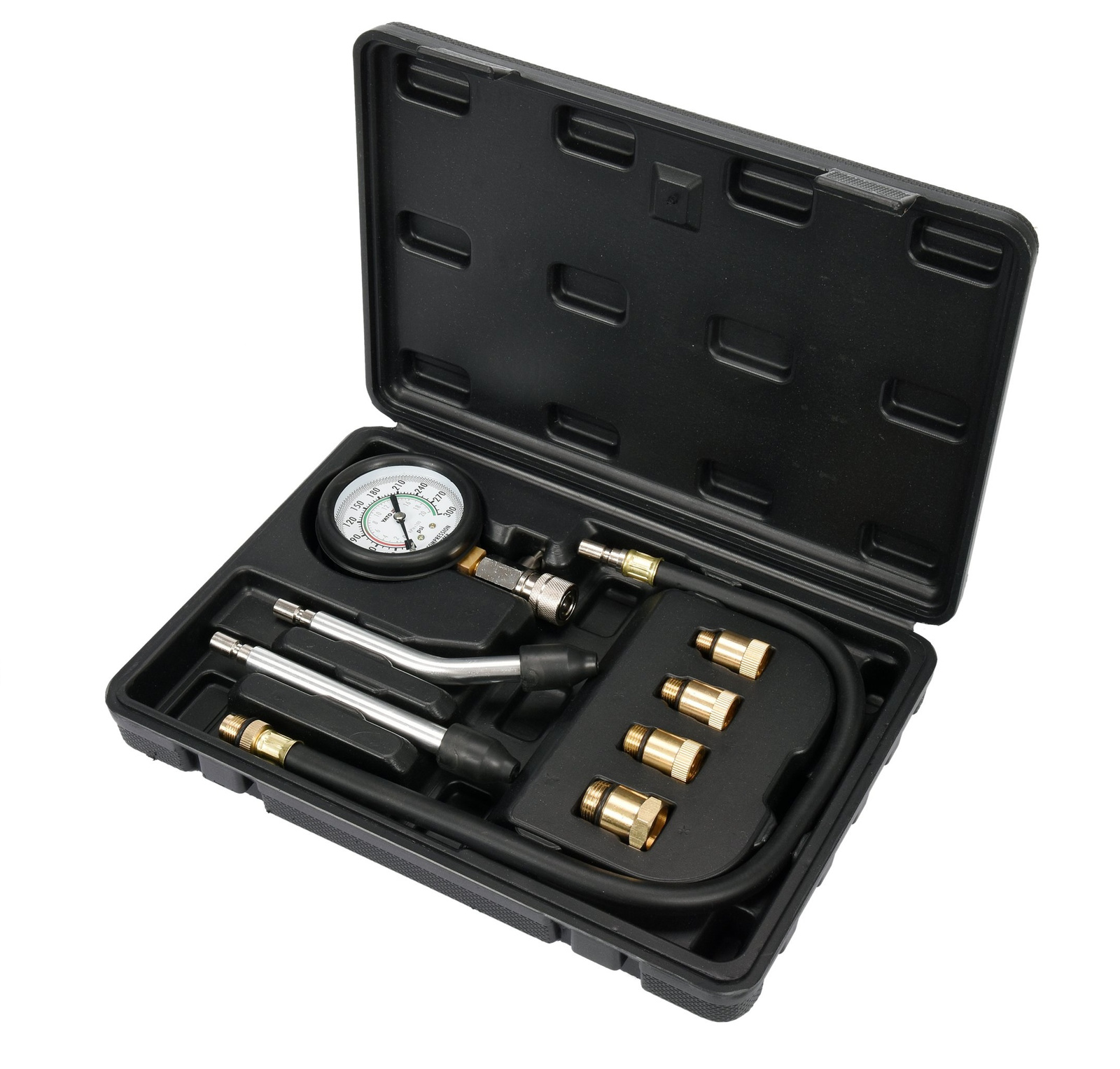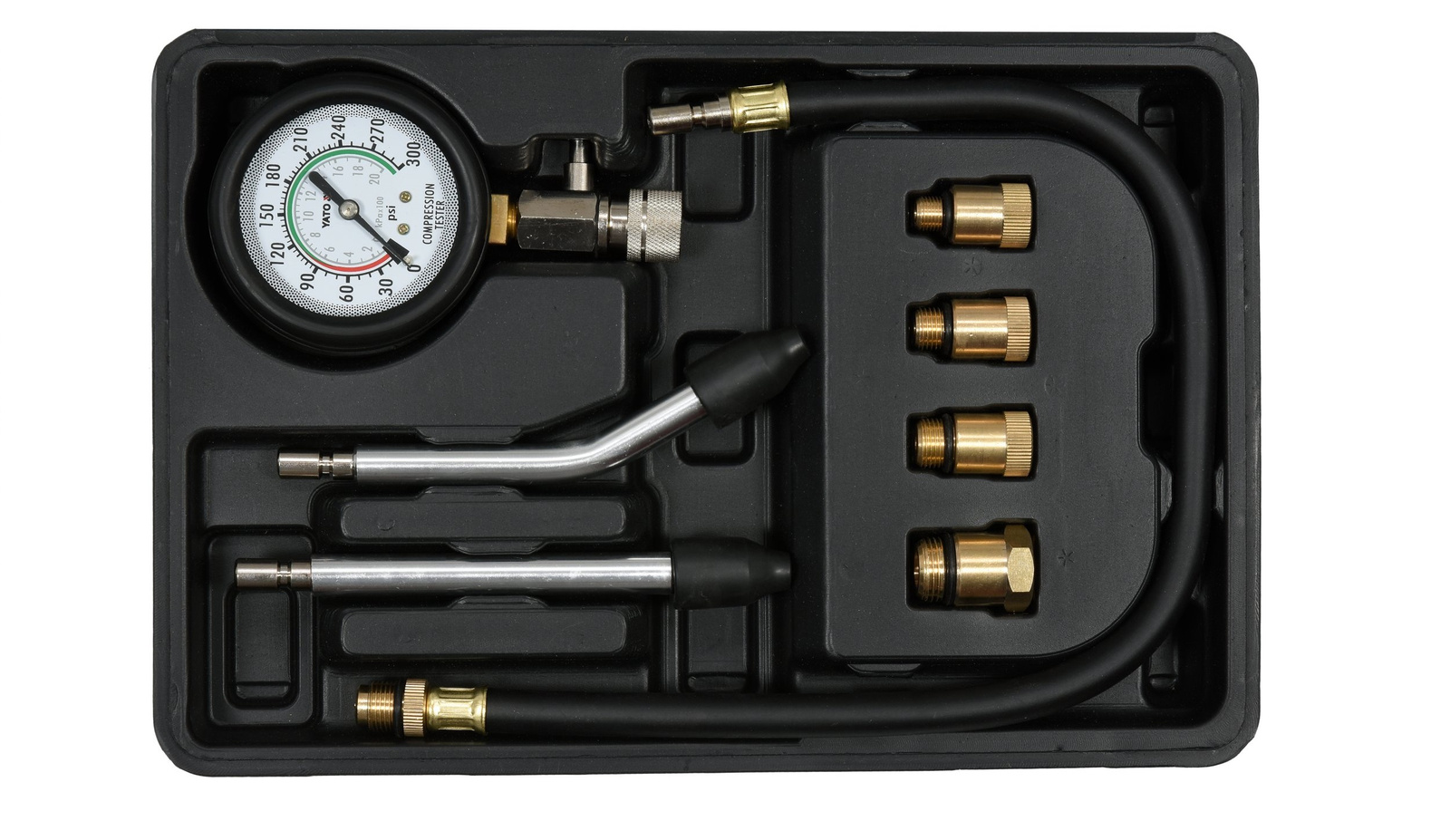- yato YT-73022 je 8dílná sada pro měření tlaku v benzinových motorech. Obsahuje manometr 0-300 psi, 4 mosazné adaptéry, 2 nástavce a 500 mm flexibilní hadici. Vše v praktickém kufříku.