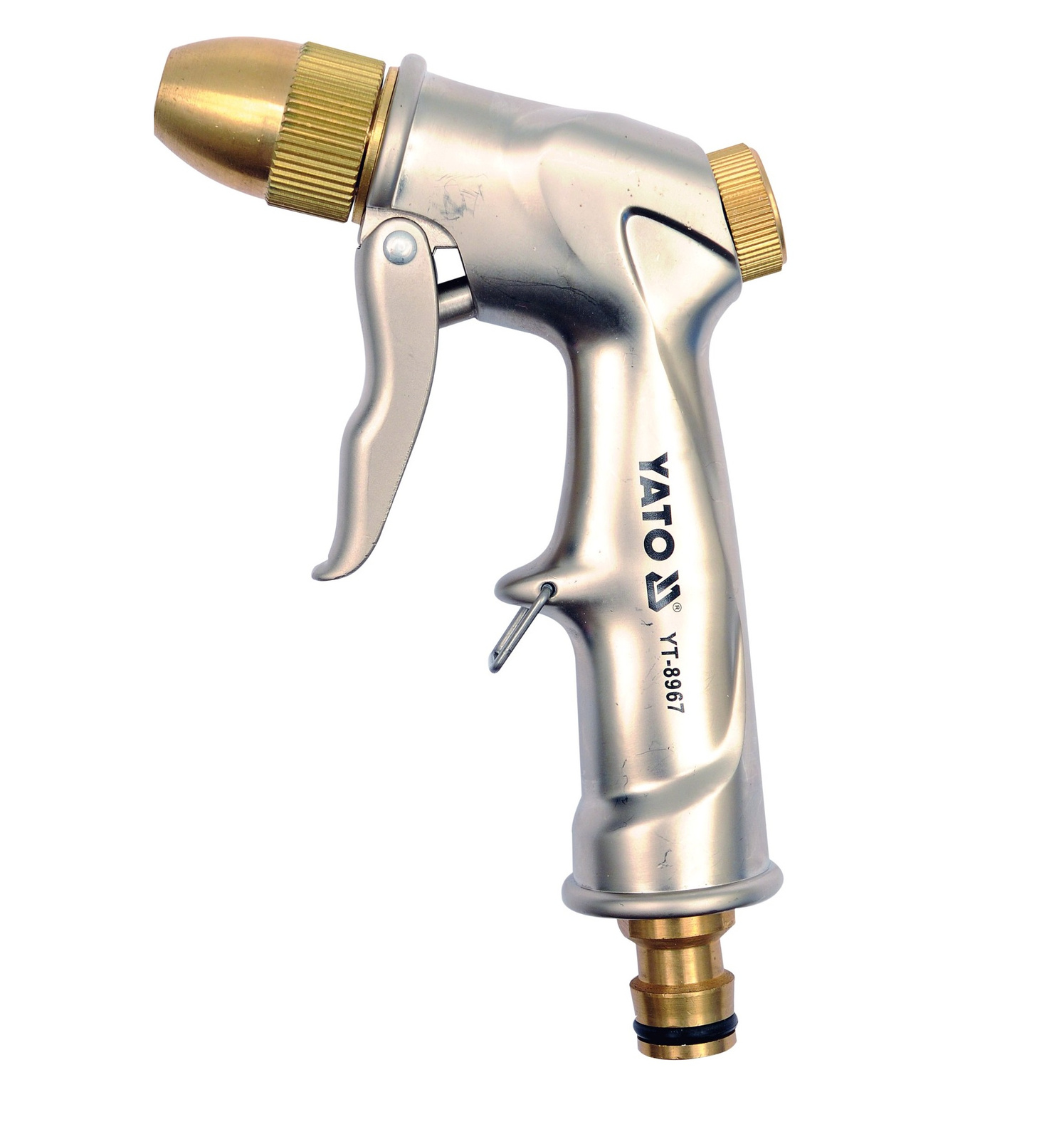 - Kovový pistolový postřikovač Yato YT-8967 s plynule nastavitelným rozprašováním od jemné mlhy po silný bodový postřik. Odolná, pohodlná na používání, ideální pro zalévání a úklid na zahradě.