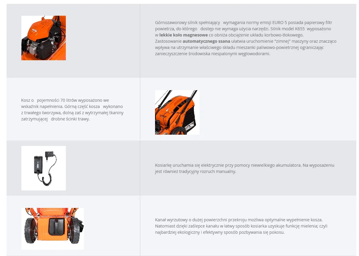 - Profilovaný nůž vyrobený z vysoce kvalitní oceli zaručuje správnou kvalitu řezu jak při práci v režimu drcení, v režimu bočního vyhazování, tak při sběru úrody do koše.
