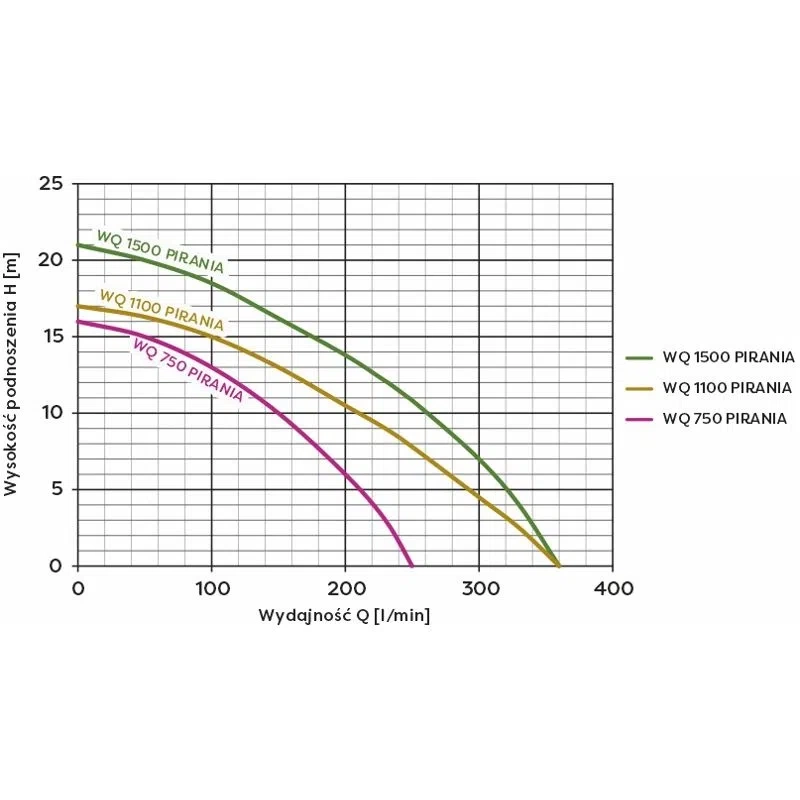 Čerpadlo má plovákové ovládání, které řídí aktivaci v závislosti na hladině čerpaného média a chrání čerpadlo před chodem nasucho. Čerpadlo je vybaveno nadproudovou ochranou na napájecím kabelu, která chrání motor zařízení proti přetížení v případě zablokování rotoru např. kniplem. WQ1500 PIRANIA lze s úspěchem použít jako čerpadlo pro vyprazdňování odpadních nádrží ve venkovských i domácích domácnostech.