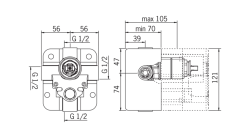 - Univerzální podomítkové těleso pro sprchovou baterii s vestavěným omezením maximální teploty vody a průtoku Vhodné pro přisazené prvky 2987, 2387, 2988 a 2388.