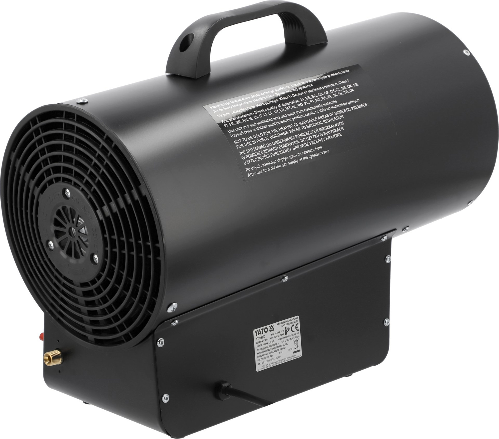 - Yato YT-99733 je plynový ohřívač o výkonu 30 kW, ideální pro vytápění velkých prostor, jako jsou dílny a sklady. Je vybavena regulací teploty a zajišťuje efektivní ohřev. Lehký a přenosný, je ideální do náročných podmínek.