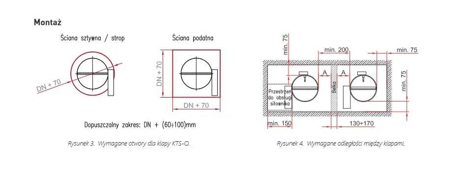 Požární klapky typu KTS lze instalovat do vertikálních příček s horizontální i vertikální osou otáčení, s libovolnou polohou pohonu.