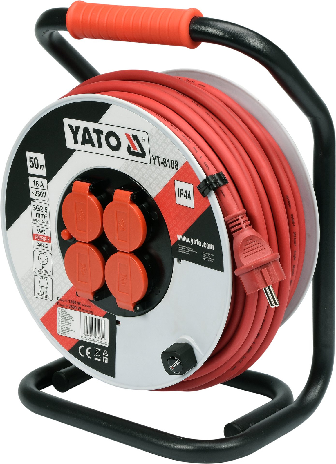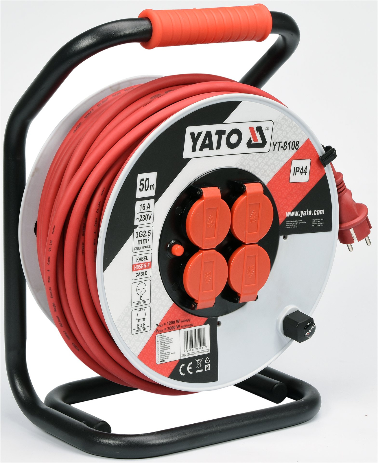 - YT-8108 50metrový stavební a dílenský prodlužovací kabelový buben se 4 zásuvkami odolnými proti prachu a stříkající vodě, tepelnou ochranou a dětskou pojistkou. Průřez jednotlivých vodičů je až 2,5 mm².