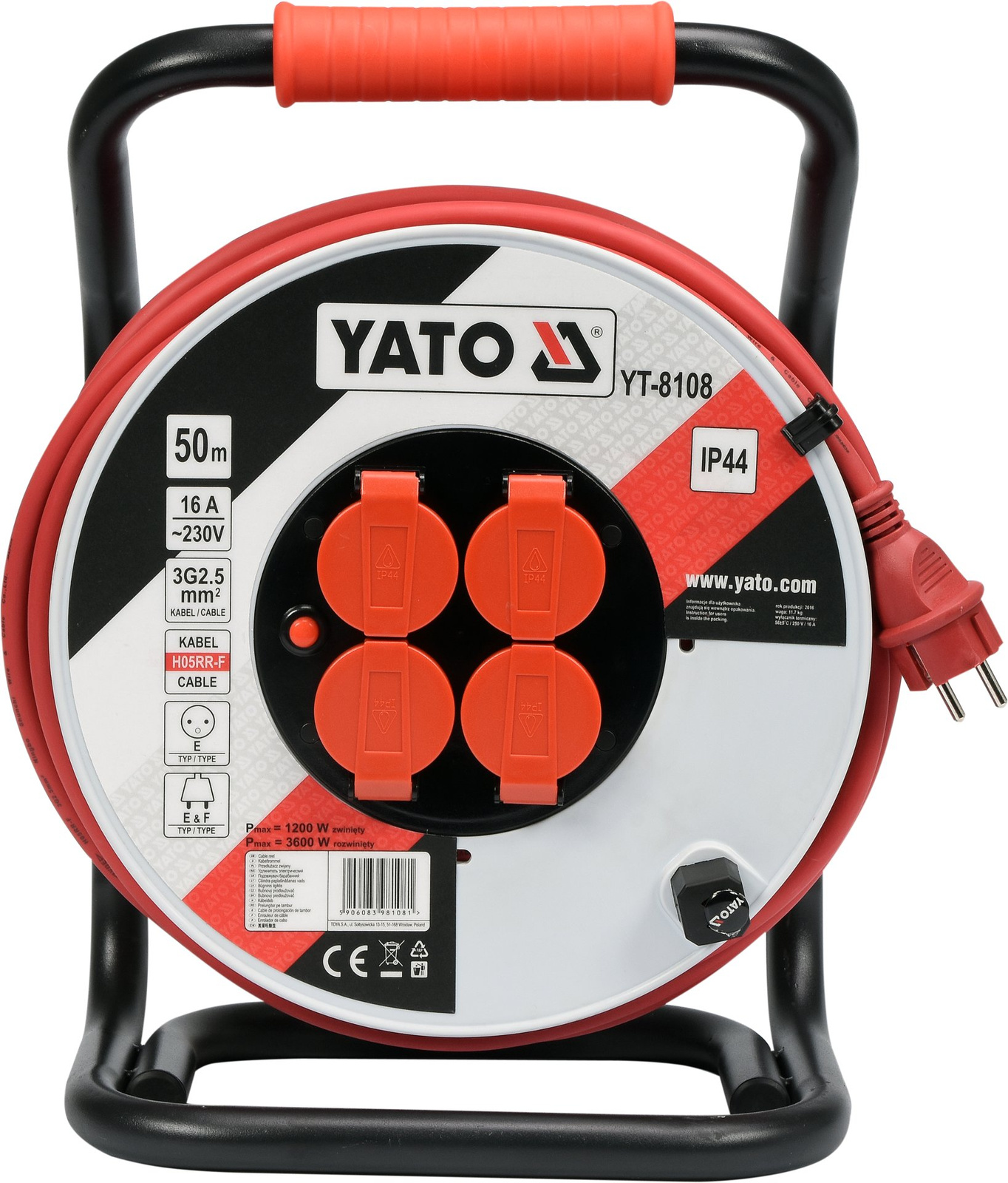 YT-8108 50metrový stavební a dílenský prodlužovací kabelový buben se 4 zásuvkami odolnými proti prachu a stříkající vodě, tepelnou ochranou a dětskou pojistkou. Díky kabelu s přírodním pogumováním, který je navinutý na cívce z odolného plastu, je prodlužovací kabel vhodný pro vnitřní i venkovní použití, např. na stavbách, v zahradách a na továrních dvorech.