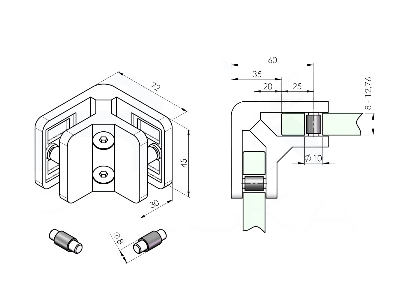 Rohový držák 45x72mm pro sklo 8-12,76mm AISI 304 broušené GC.012.XX.04.S