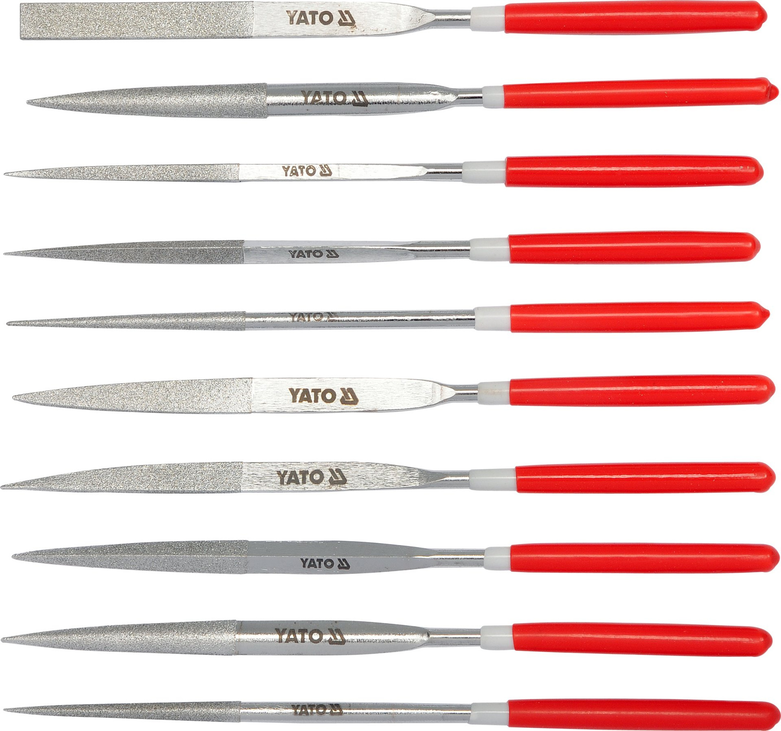 - Sada diamantových pilníků Yato YT-6151 (10 ks).4x160x50 mm) pro jemné obrábění tvrdých materiálů - kov, sklo, keramika, kámen. Různé tvary, odolné diamantové zrno, praktické pouzdro. Ideální pro modelování a dokončovací práce.
