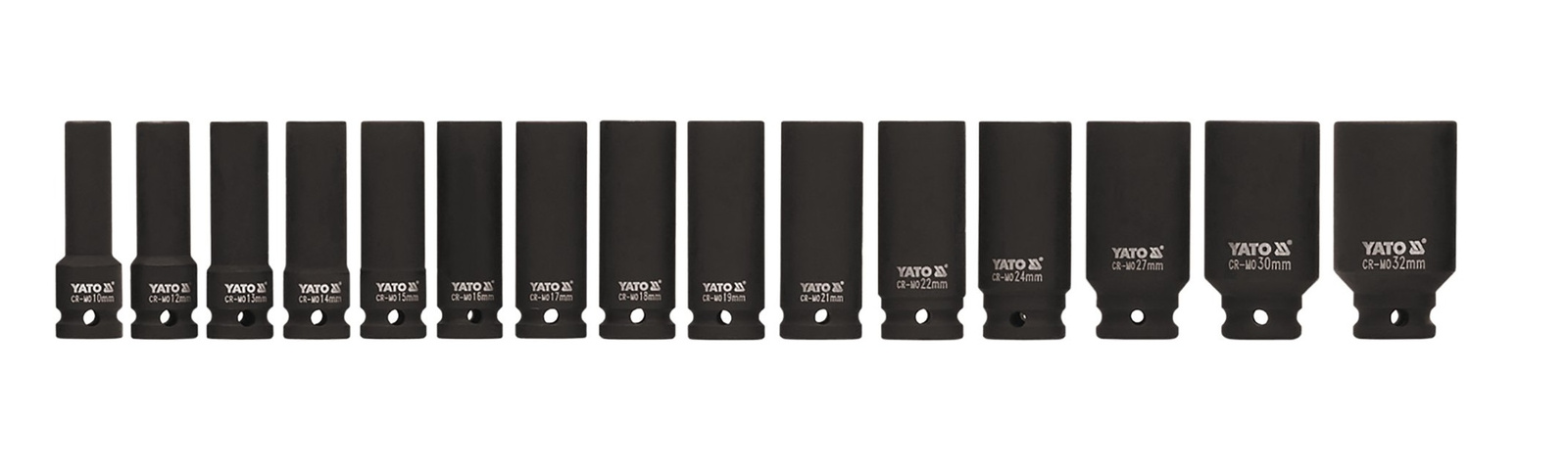 - Sada 15 dlouhých nástrčných hlavic Yato 1/2" z CrMo oceli SCM-440. Robustní, pro použití s pneumatickými klíči, se systémem AS-DRIVE. Velikosti 10-32 mm v kovovém pouzdře. Ideální pro pneumatikářské a automobilové dílny.