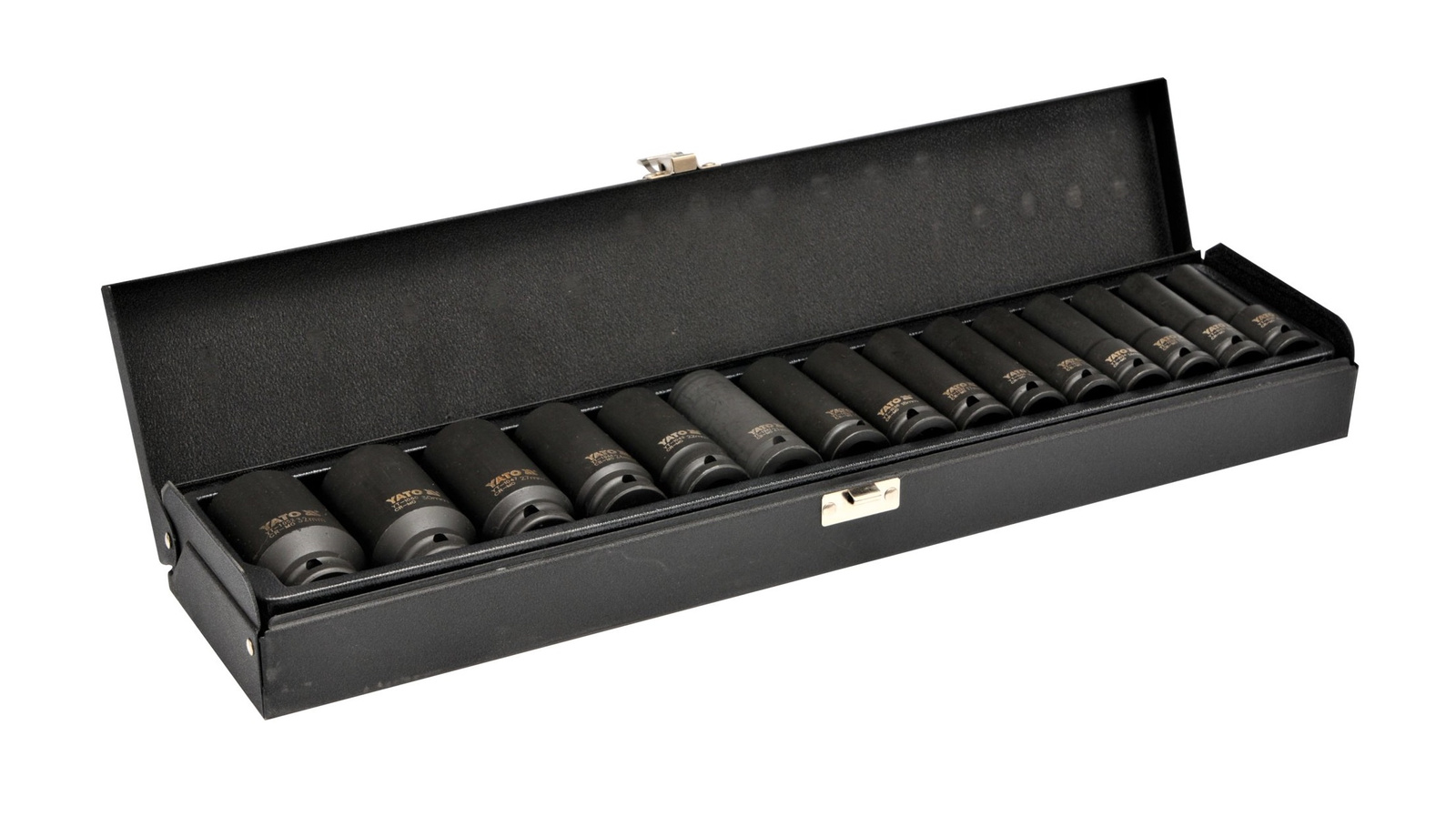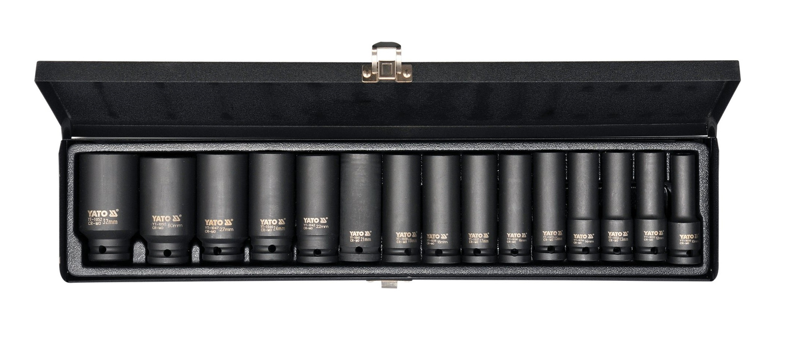 Dlouhé rázové hlavice Yato - sada 15 nástrčných klíčů. Zásuvky doporučené zejména pro profesionální pneuservisy a autoservisy.
