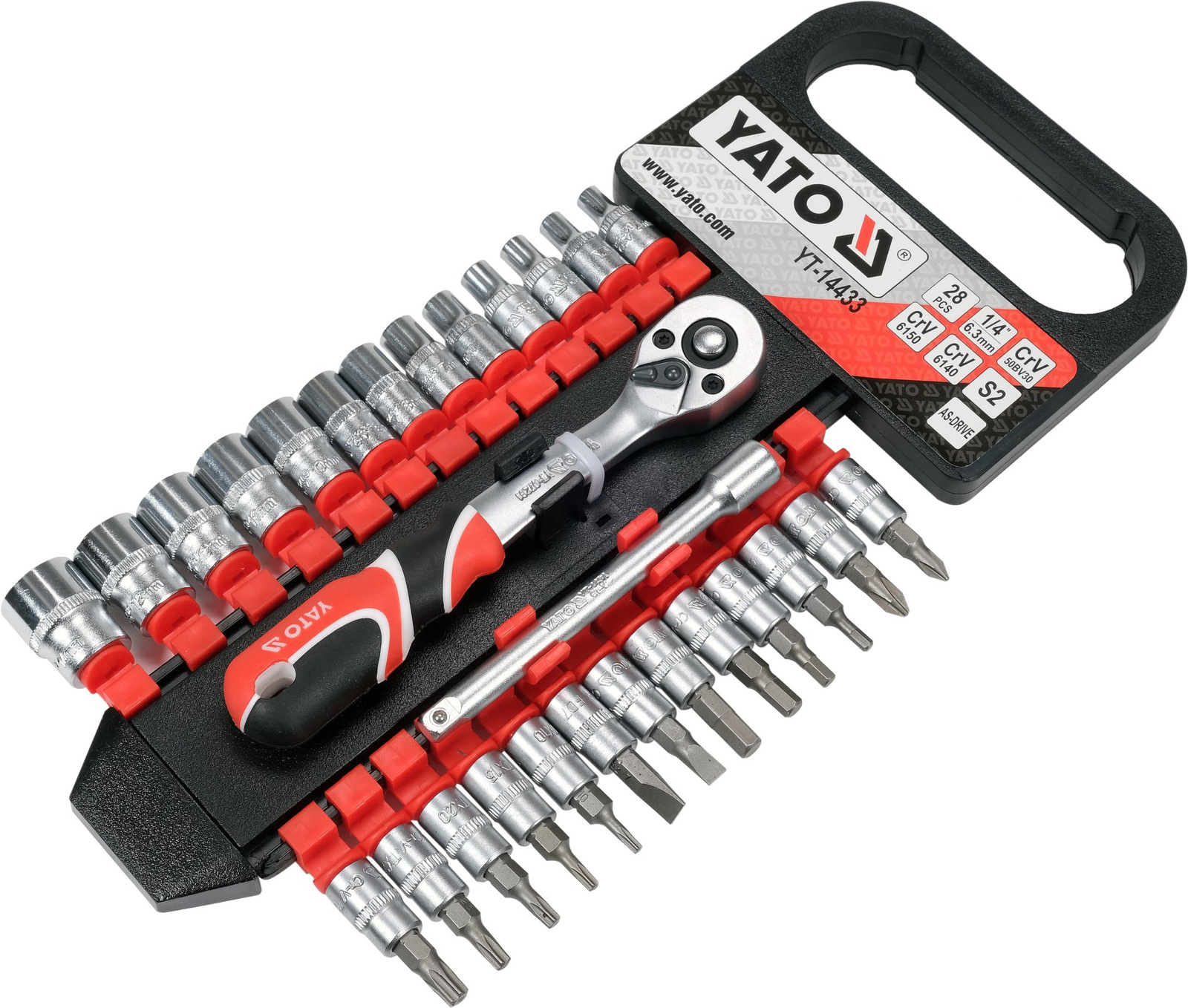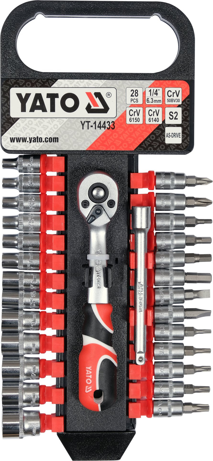 - Sada nástrčných hlavic Yato YT-14433 1/4" obsahuje 28 položek, včetně ráčny, nástrčných hlavic a bitů. Vyrobeno z odolné CrV oceli, ideální pro dílnu a domácí použití. Vše v praktickém pouzdře pro pohodlné skladování.