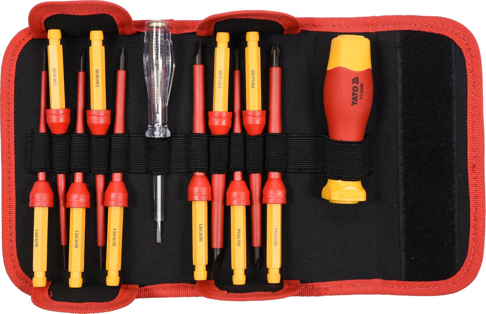 - Sada izolovaných šroubováků Yato YT-28290 (12 kusů) s certifikací VDE. Vysoce kvalitní CrV ocel, ergonomické rukojeti, zkoušečka napětí a magnetizér. Ideální pro elektrikáře a kutily.