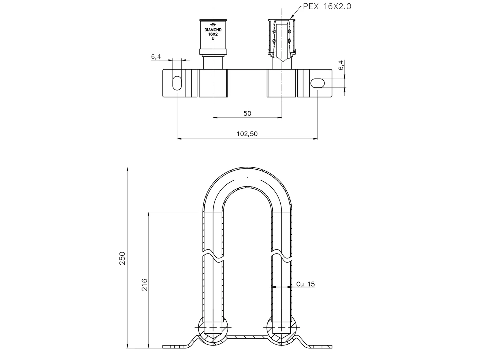 Sestava diamantového kolena s upevněním na měděnou trubku, lisovaná na PEX FZZ-015.16X15