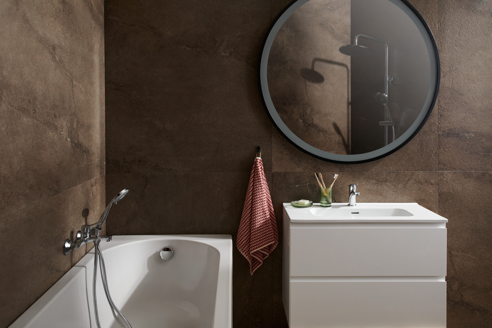 - Každý má umyvadlovou baterii, na výběr je bodová sprcha s vanovou baterií nebo posuvná sprcha se sprchovou baterií.