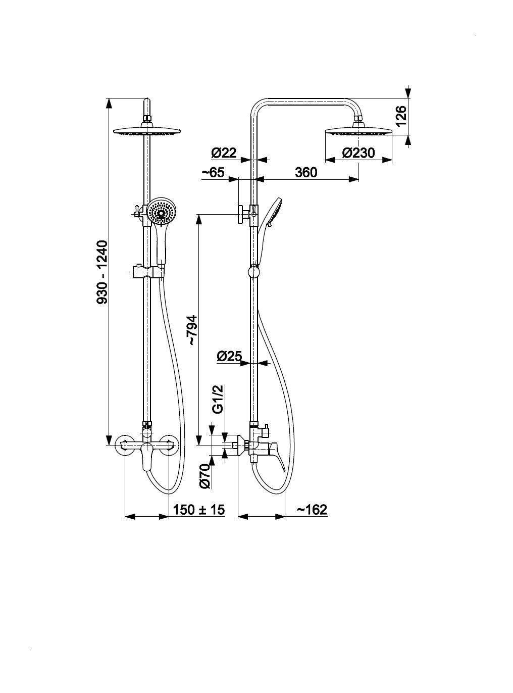 kompletní baterie, horní/spodní sprchová tyč, kloubový kotouč, sprchové madlo s madlem, instalační sada (excentry s těsněním + rozety - 2 ks, montáž tyče na stěnu pomocí montážního šroubu - 1 ks), sprchová hadice z PVC (L = 1500 mm), bílé montážní rukavice