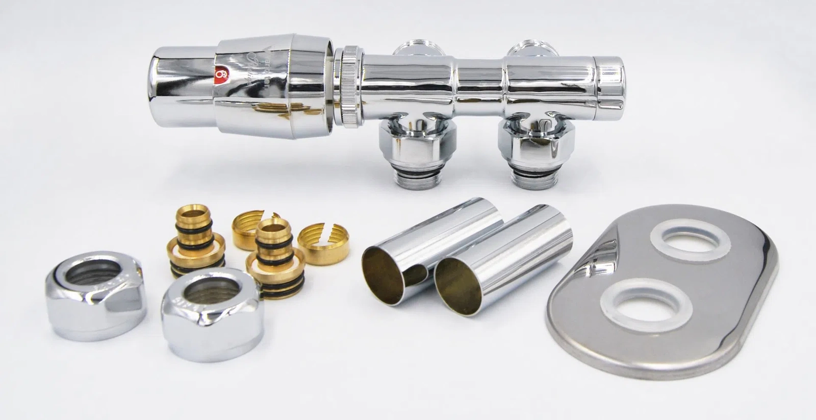 - Dvojitá maskovací rozeta, maskovací pouzdro, PEX nebo měděné konektory.