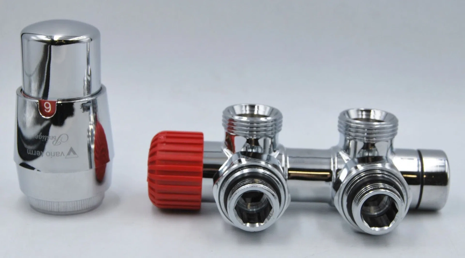 - Konstrukce připojení "Twins" umožňuje instalaci pod radiátor s hlavou rovnoběžnou se stěnou, uvnitř obrysu radiátoru, což jej chrání před náhodným poškozením.