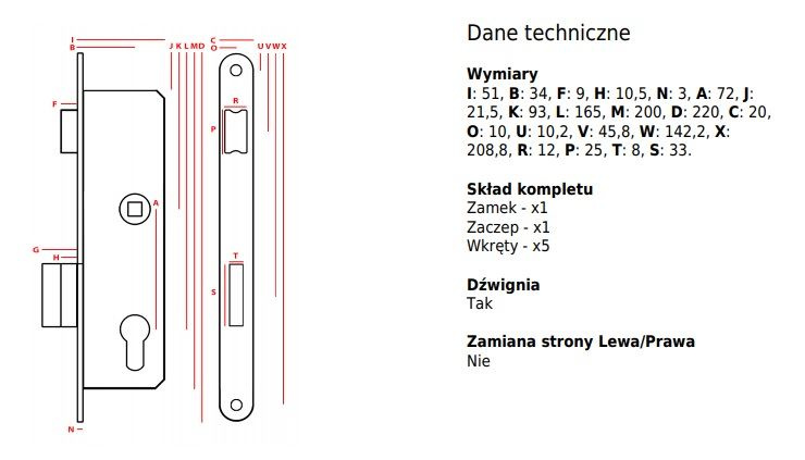 • Rozměry: I: 51, B: 34, F: 9, H: 10,5, N: 3, A: 72, J: 21,5, K: 93, L: 165, M: 200, D: 220, C: 20, O: 10, U: 10,2, V: 45,8, W: 142,2, X: 208,8, R: 12, P: 25, T: 8, S: 33