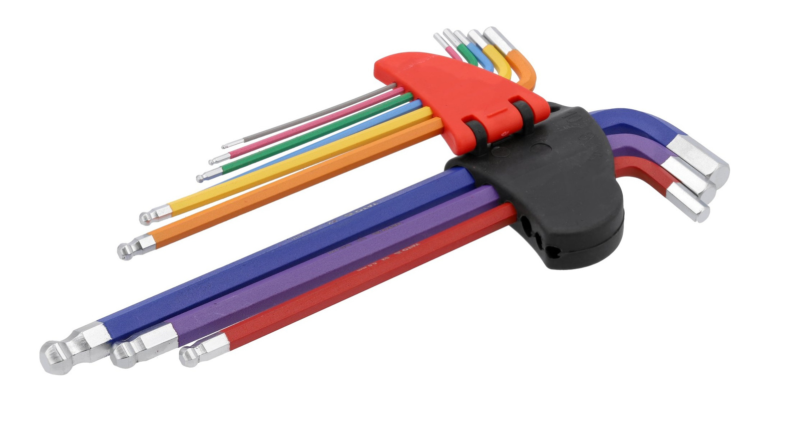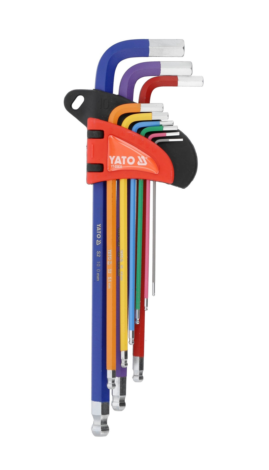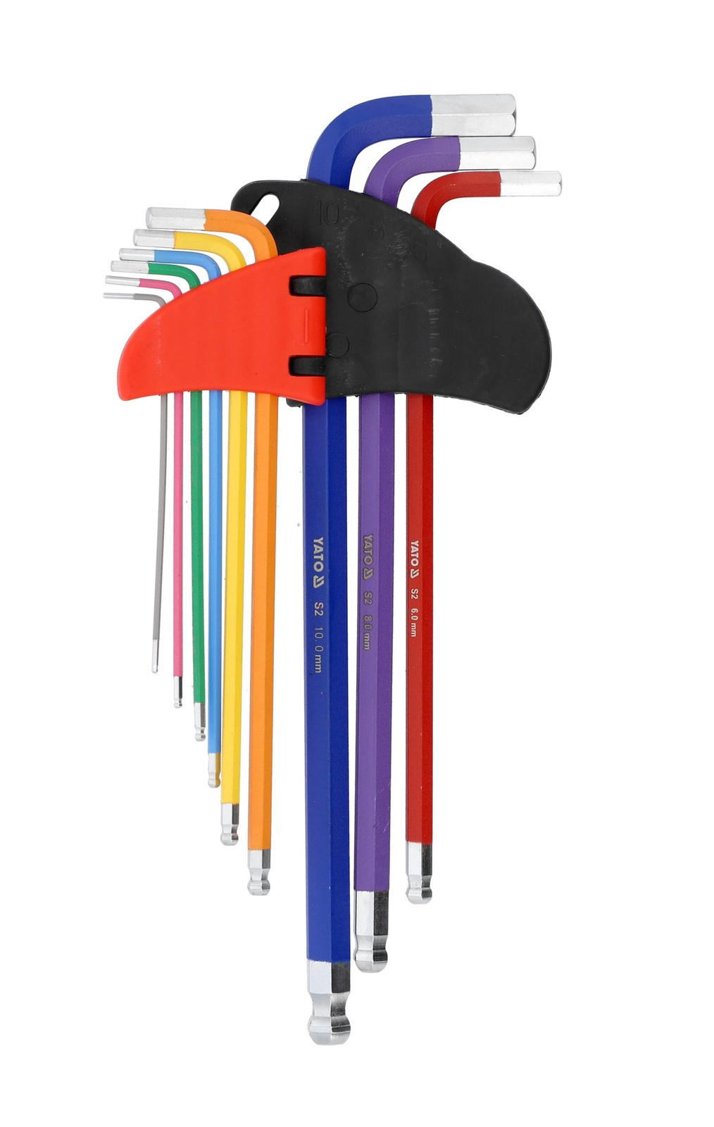- Sada 9 dlouhých imbusových klíčů 1,5-10 mm s kulovým koncem. Vyrobeno z oceli S2 (58-62 HRC), matný povrch, možnost opracování pod úhlem 25°. Barevné značení a praktický klip pro snadné uspořádání.