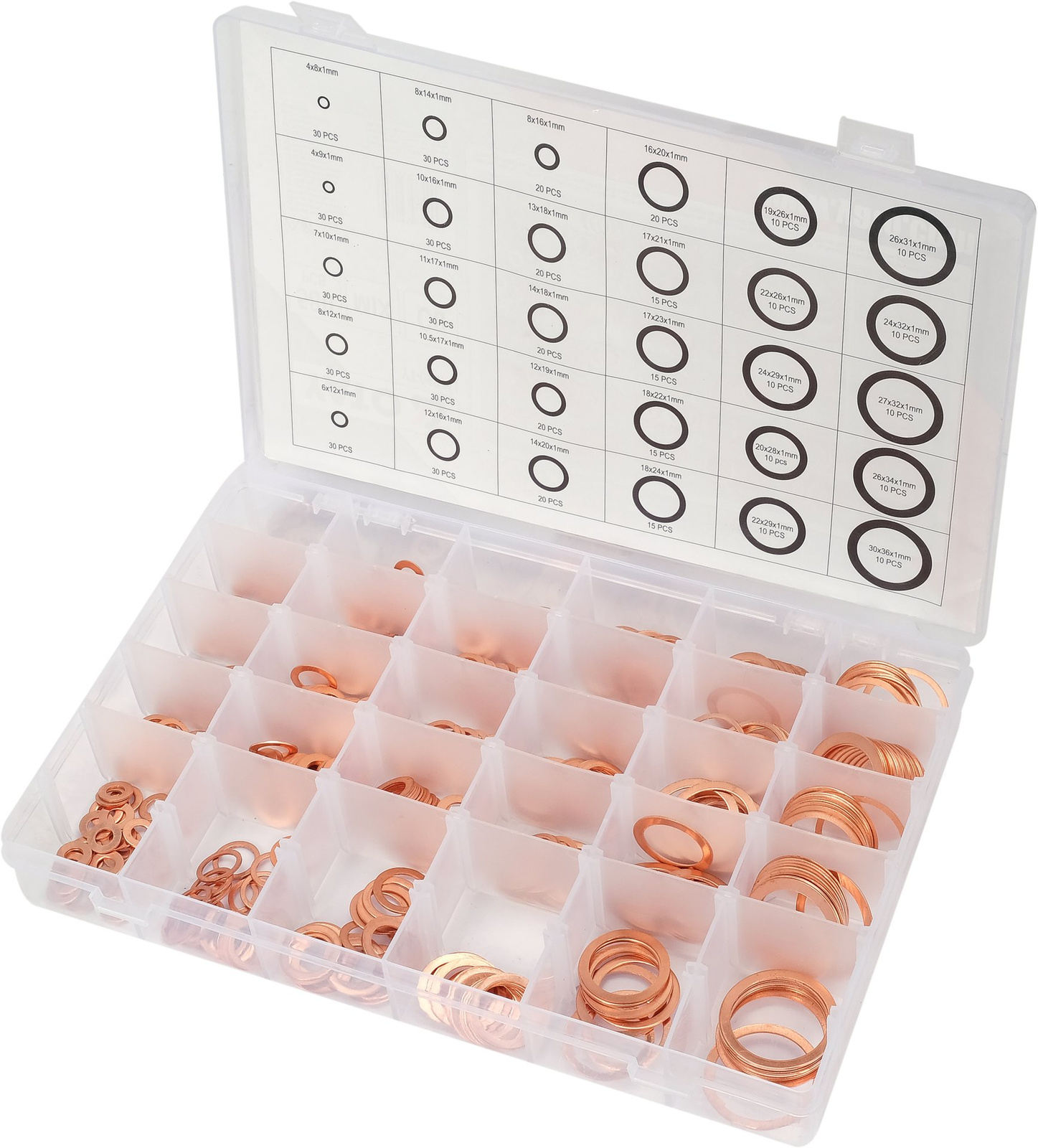 obsahující 580 kusů měděných podložek v různých velikostech.