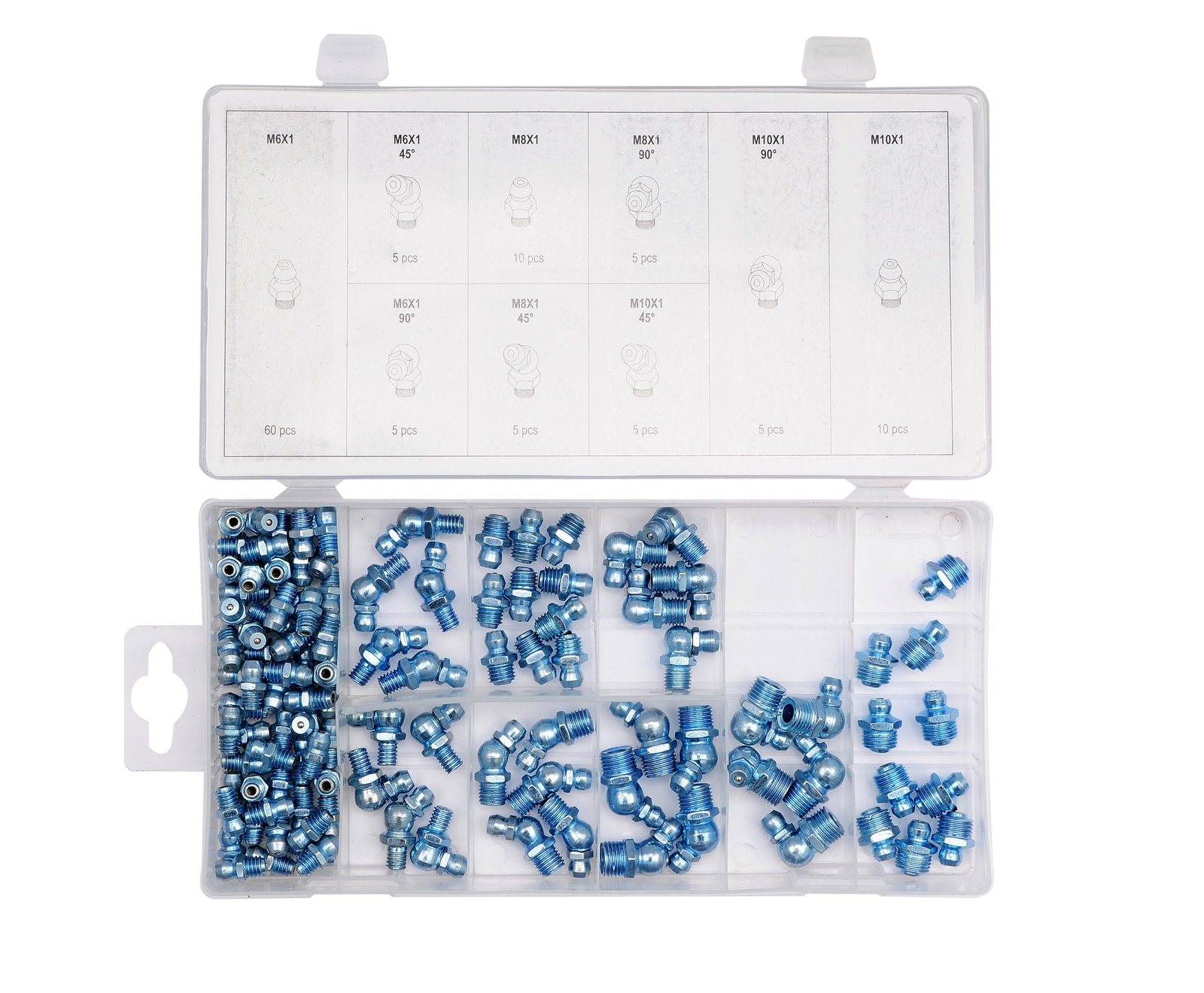- Obsah sady: maznice x110 (M6x1 mm x60, M6x1 mm 45˚ x5, M6x1 mm 90˚ x5, M8x1 mm x10, M8x1 mm 45˚ x5, M8x1 mm 90˚ x5, M10x1 mm x10, M10x1 mm 45˚ x5, M10x1 mm 90˚ x5)