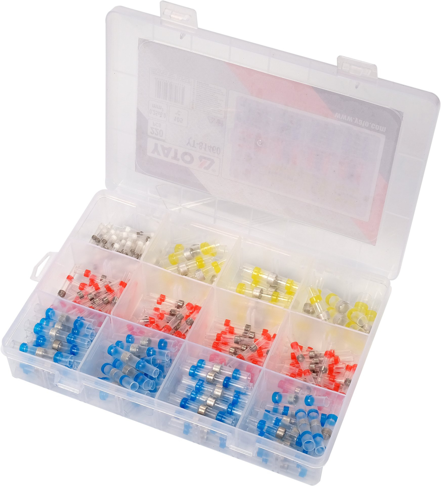 - Sada 220 smršťovacích bužírek Yato YT-81460 (0,25-6 mm², PE) s cínem a těsnícím lepidlem. Odolný povětrnostním vlivům, pružný při nízkých teplotách, smrštění 3:1. Ideální pro odolné a těsné kabelové spoje.