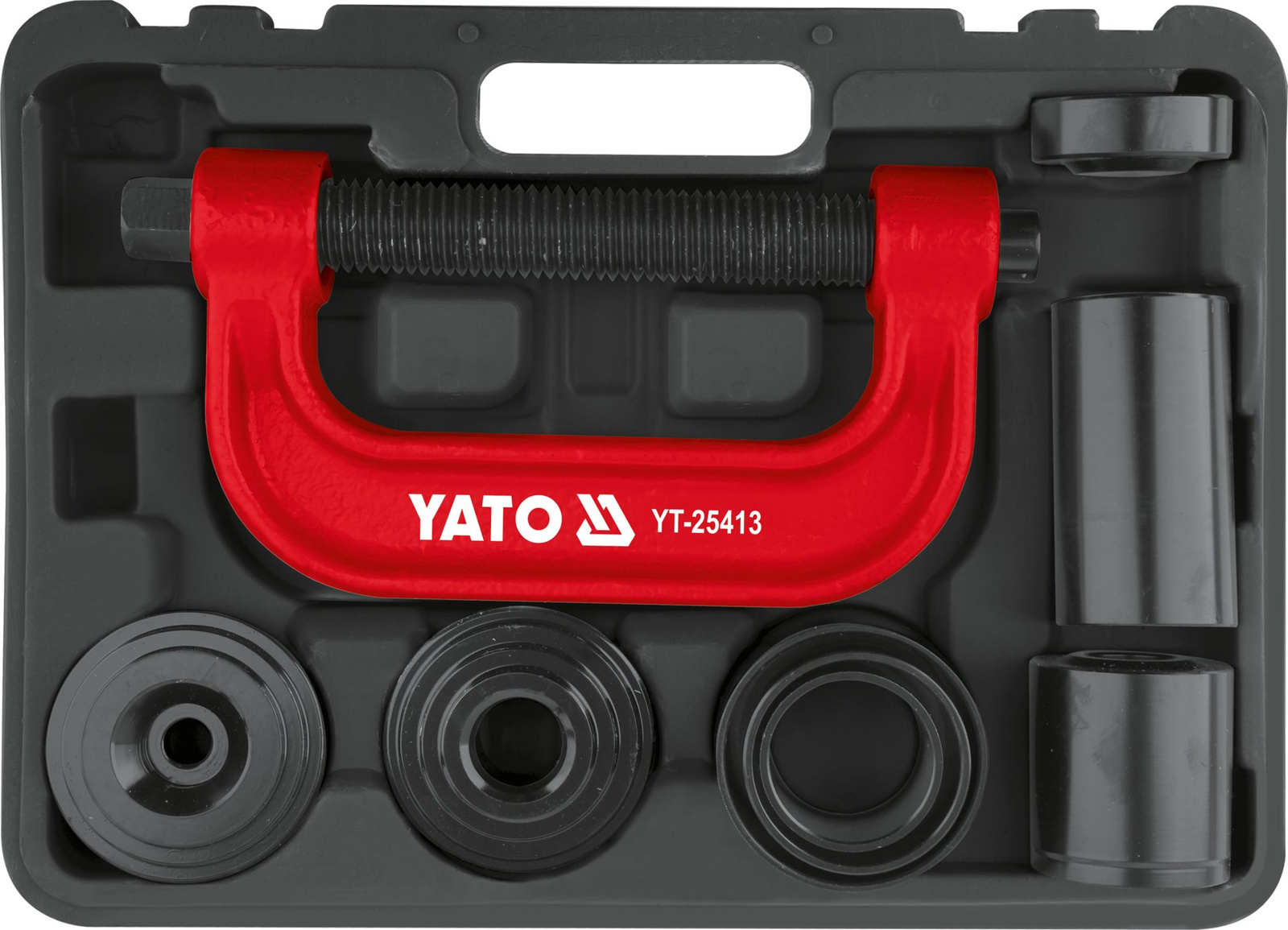 - Šroubový lis Yato YT-25413 (rozsah 130 mm) pro instalaci a demontáž čepů a pouzder bez demontáže zavěšení. Sada je vyrobena z uhlíkové oceli #45 a obsahuje 9 prvků a praktický kufr. Ideální pro mechaniky.