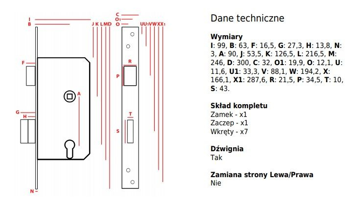 Zámek vkládací brány Jania s pákou, pravý ZP-SW-251