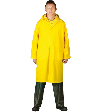 • Kabát je vyroben ze směsi 65% PVC a 35% polyesteru, díky čemuž je voděodolný a odolný. Zapíná se na zip s dalšími patentkami, má kapuci se stahovací šňůrkou a dvě vnější kapsy. Manžety na rukávech chrání před větrem. XXL.